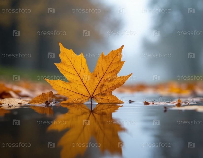 Осенний одинокий лист в луже, размытый фон. Сгенерированный ИИ