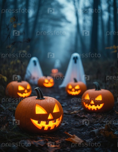 Сияющие тыквы в лесу и призраки, Хэллоуин. Сгенерированный ИИ