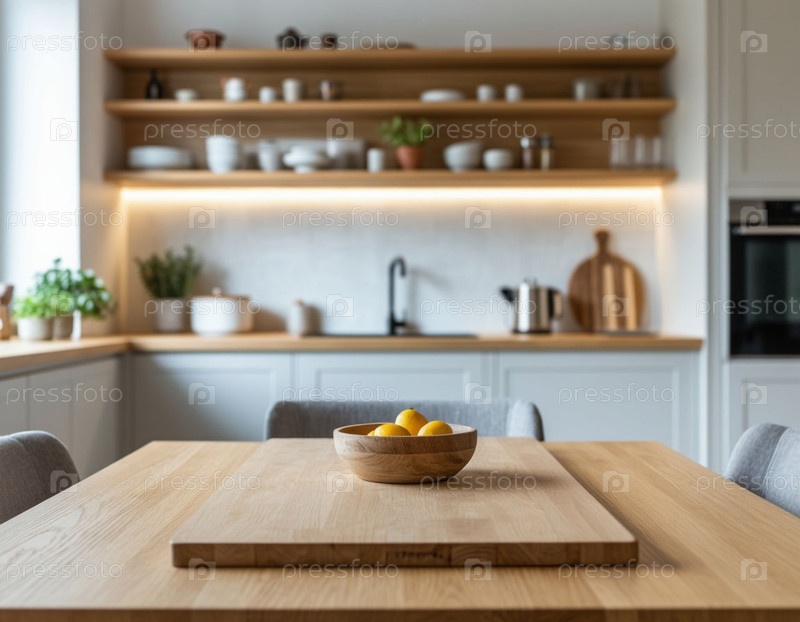 Стол и размытый кухонный фон. Стиль минимализма. Сгенерированный ИИ