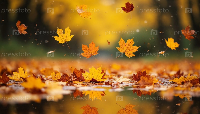 Осенние листья падают в лужу в парке. Сгенерированный ИИ