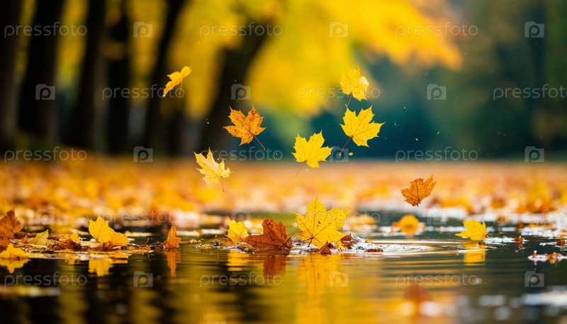 Осенние золотые листья попадают в лужу в парке. Сгенерированный ИИ