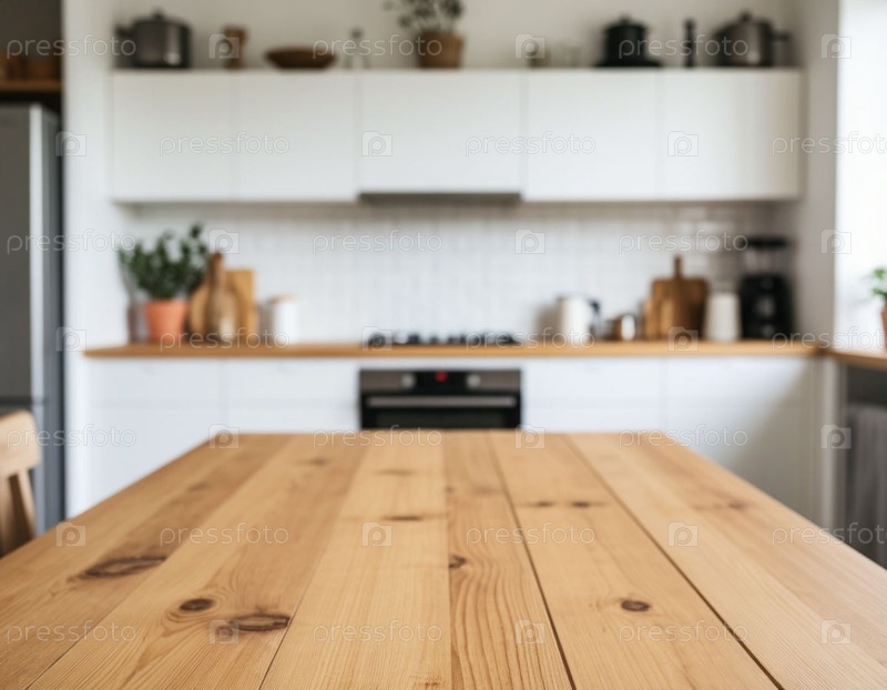 Стол и размытый кухонный фон. Стиль минимализма. Сгенерированный ИИ
