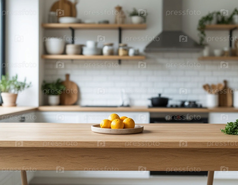 Стол и размытый кухонный фон. Стиль минимализма. Сгенерированный ИИ