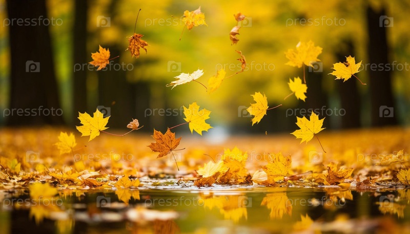 Осенние золотые листья попадают в лужу в парке. Сгенерированный ИИ