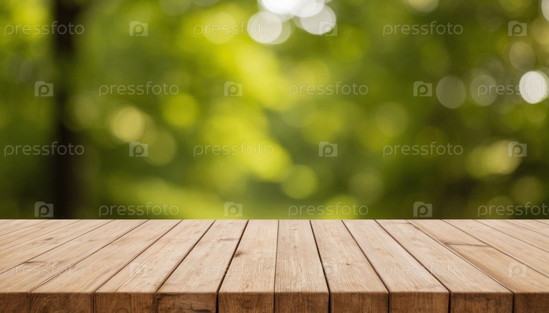 Деревянный стол и размытый природный фон боке. Сгенерированный ИИ