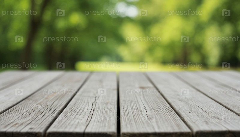 Деревянный стол и размытый природный фон боке. Сгенерированный ИИ