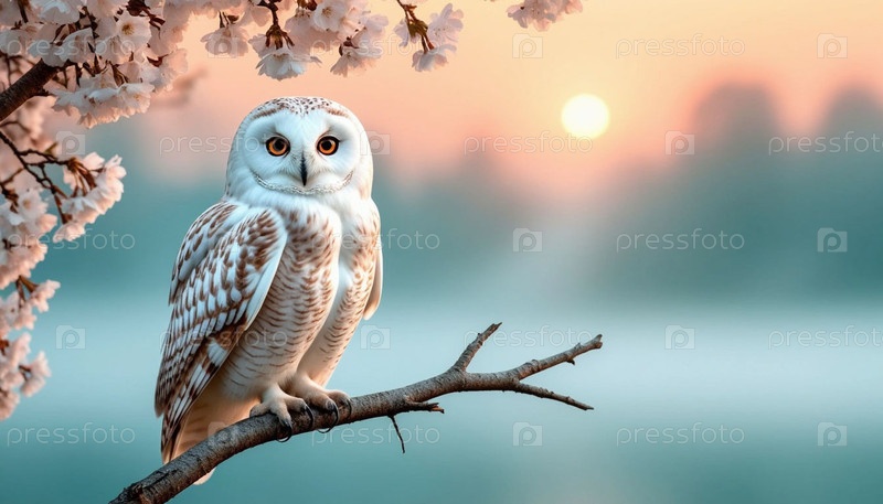 Снежная сова, сидящая на ветке в тумане на рассвете. Фотореалистическая иллюстрация
