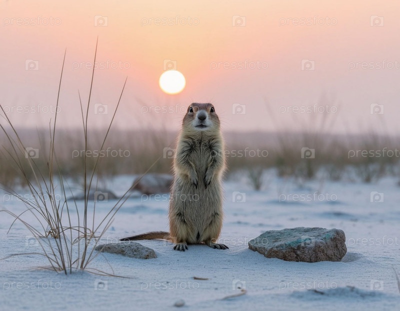 Гофер стоит в пустыне на рассвете