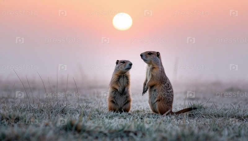 Наземные белки в степи утром во время тумана