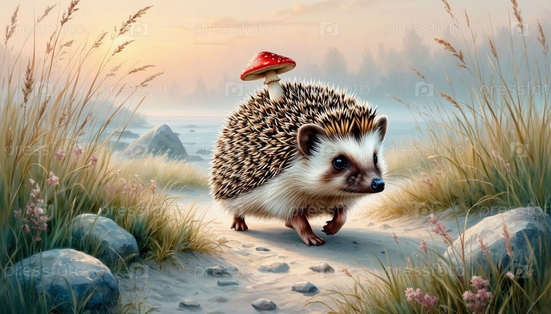 Еж с грибом на спине бежит по тропинке. Искусство сюрреализма