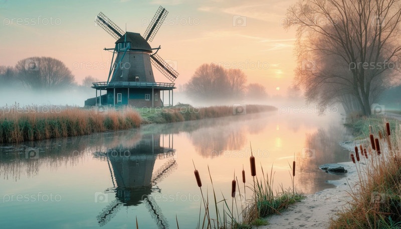 Волшебный домик на рассвете у реки. Красивый пейзаж