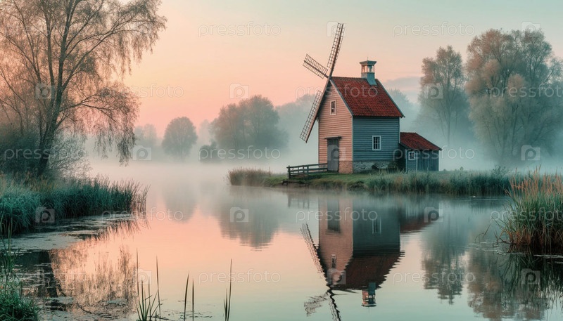 Волшебный домик на рассвете у реки. Красивый пейзаж