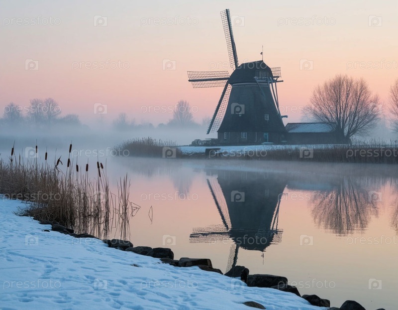 Волшебный домик на рассвете у реки. Красивый пейзаж
