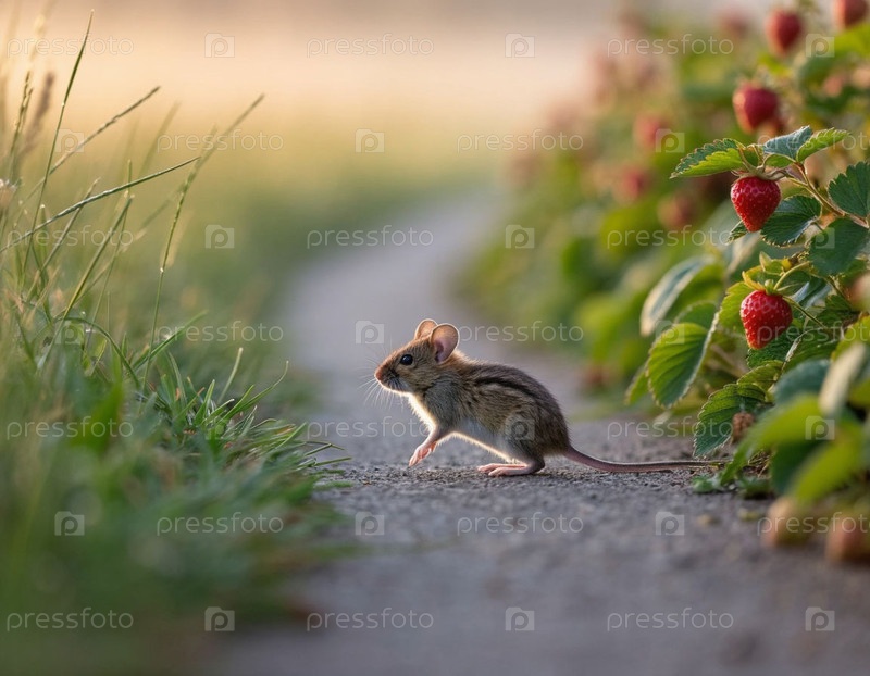 Полевая мышь на тропе, трава и клубника в поле
