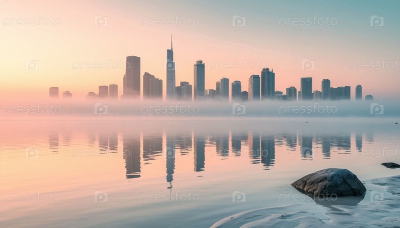 Утренний туман в городе и отражение в воде