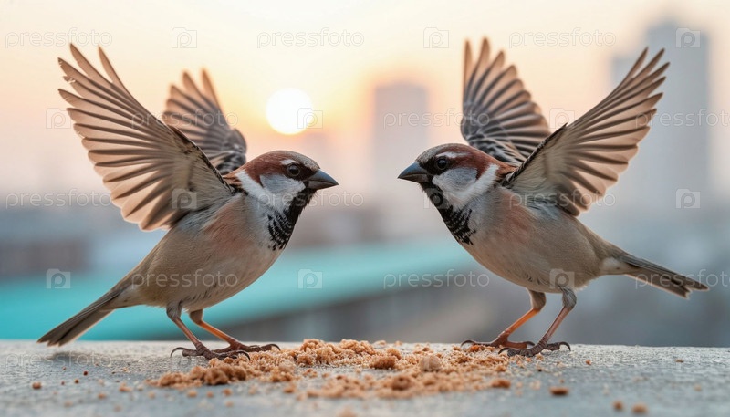 Два городских воробья дерутся за крошку хлеба, утренний туман