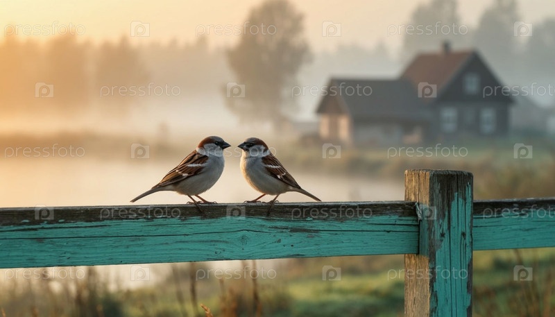 Два воробья на заборе, сельский пейзаж, утренний туман