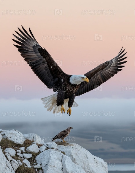 Орел учит орла летать, белые скалы и нежный рассвет. Фотореалистичный сюрреализм