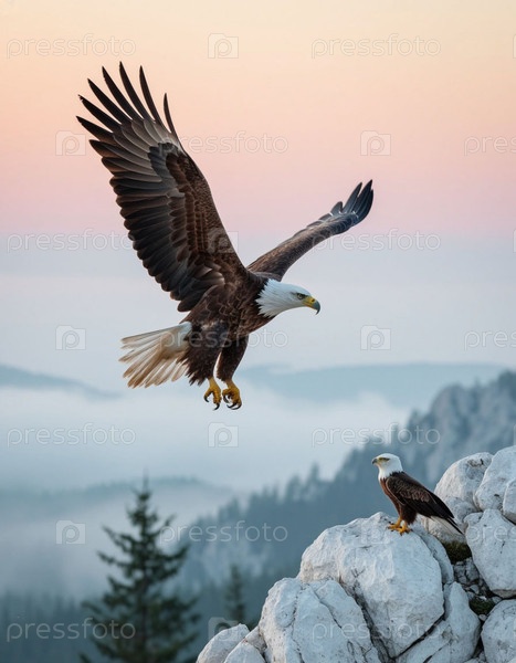 Орел учит орла летать, белые скалы и нежный рассвет. Фотореалистичный сюрреализм