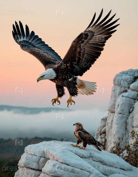 Орел учит орла летать, белые скалы и нежный рассвет. Фотореалистичный сюрреализм