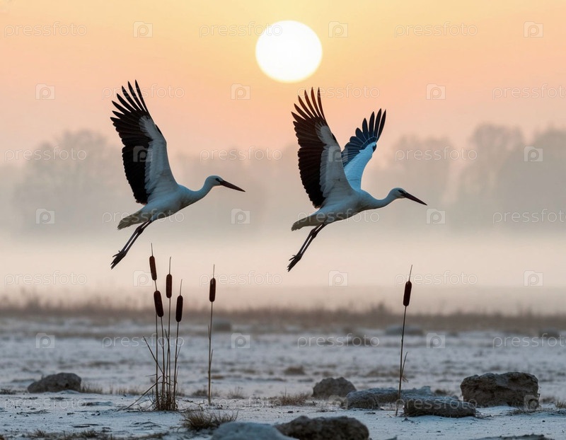 Два айста пересекаются в поле над тростником в тумане
