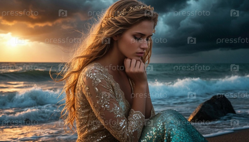 Русалочка сидит на берегу моря на закате. Искусство сюрреализма