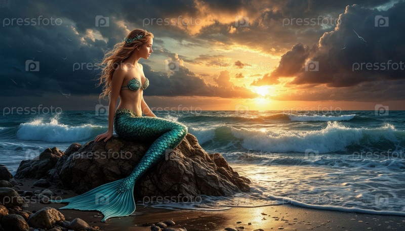 Русалка седит на скале у шва замка. Роскошный сюрреализм