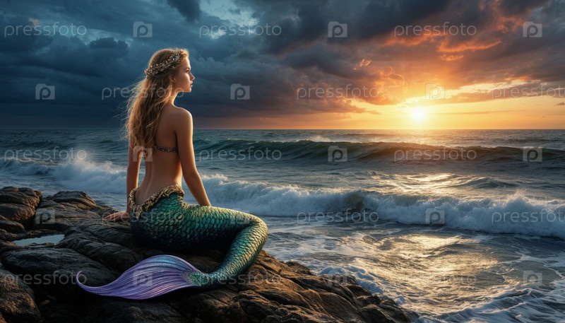 Русалка седит на скале у шва замка. Роскошный сюрреализм
