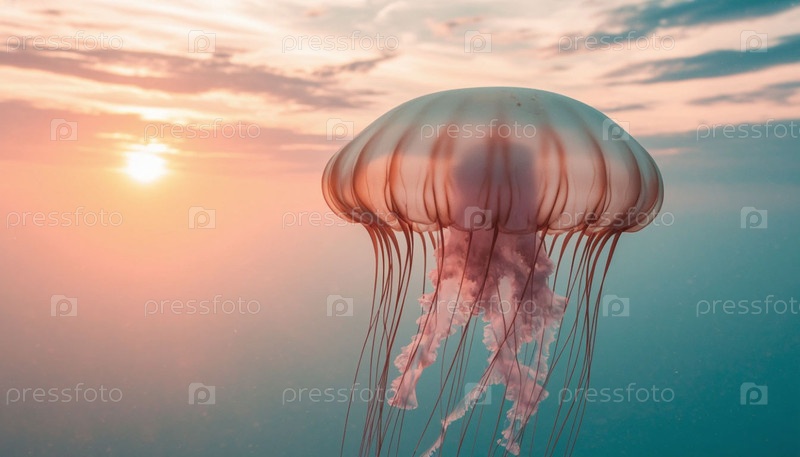 Морская медуза под водой в лучах восходящего солнца