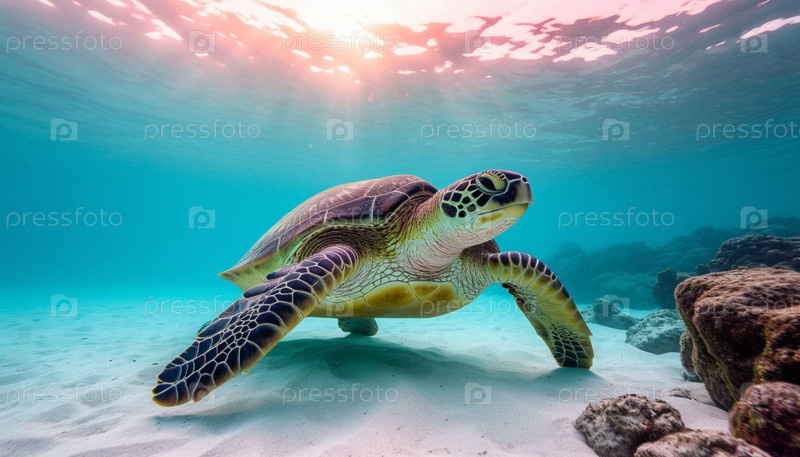 Морская черепаха под водой в лучах солнца на рассвете