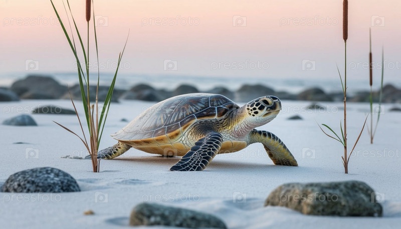 Морская черепаха ползает по пляжу на рассвете