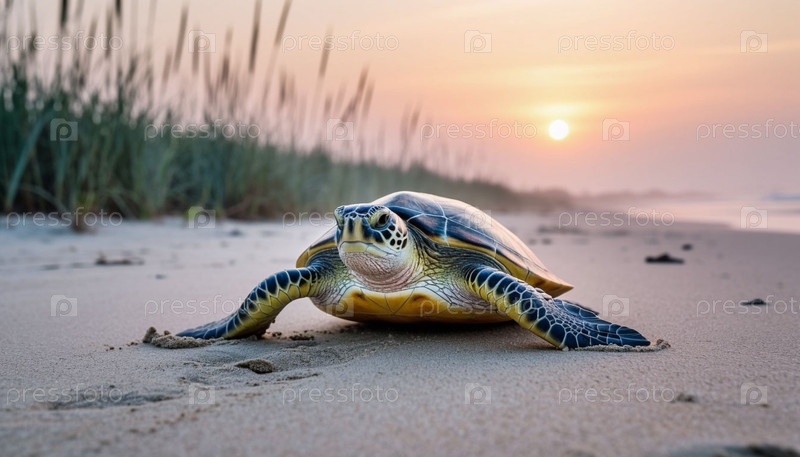 Морская черепаха ползает по пляжу на рассвете
