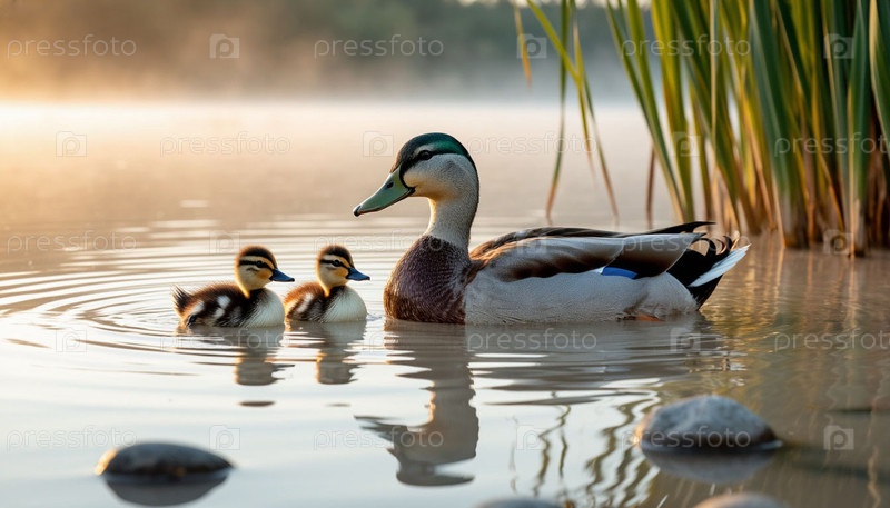 Утка с утятами в озере на рассвете
