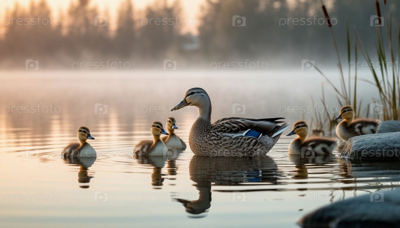 Утка учит уток плавать в озере на рассвете