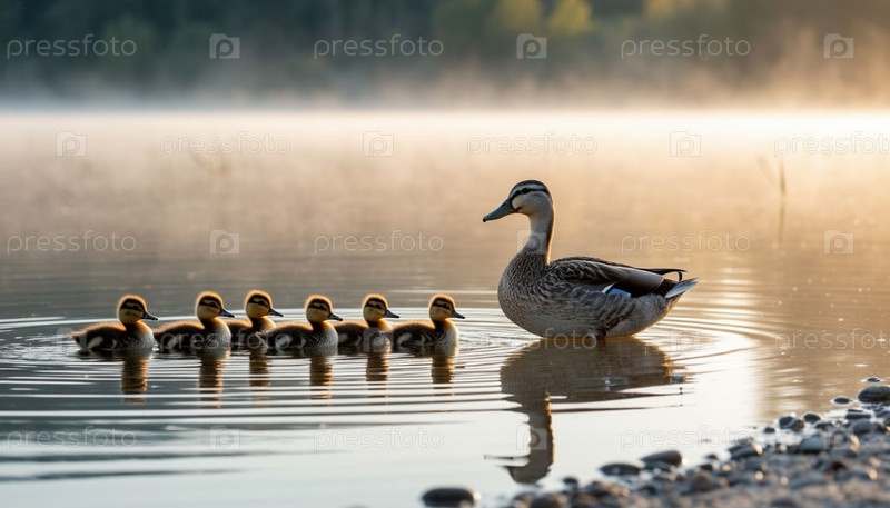 Утка учит уток плавать в озере на рассвете