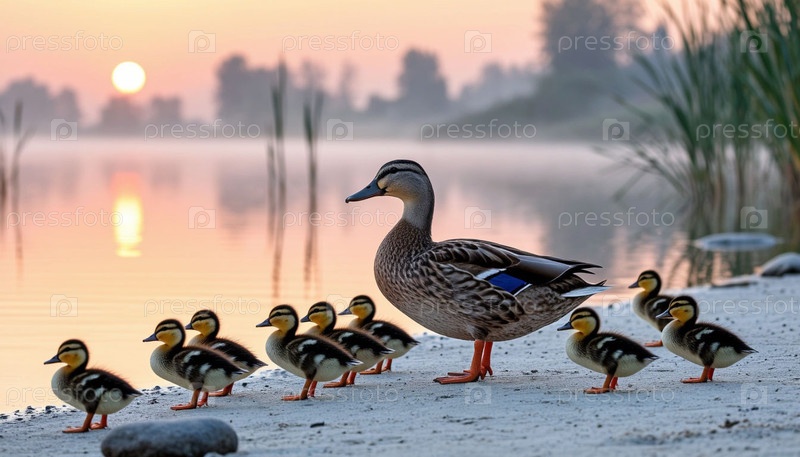 Утка с утками на берегу озера на рассвете