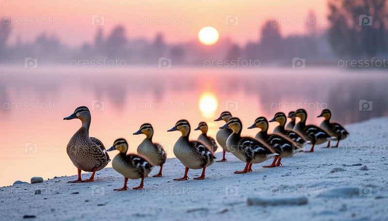 Утка с утками на берегу озера на рассвете