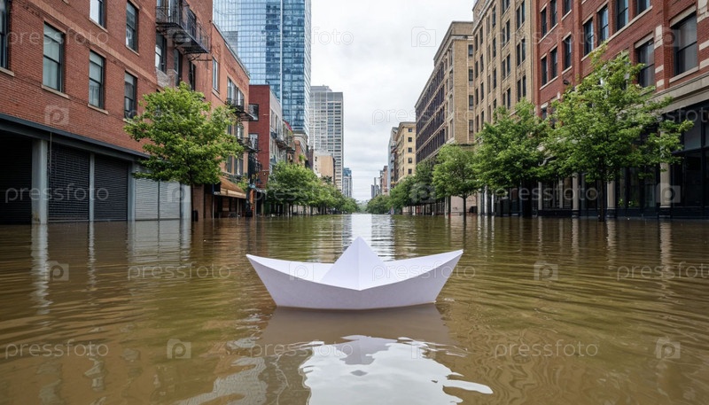Бумажная лодка проходит через затопленный город