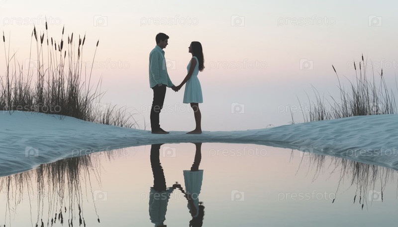 Силуэт пары парня и девушки на рассвете
