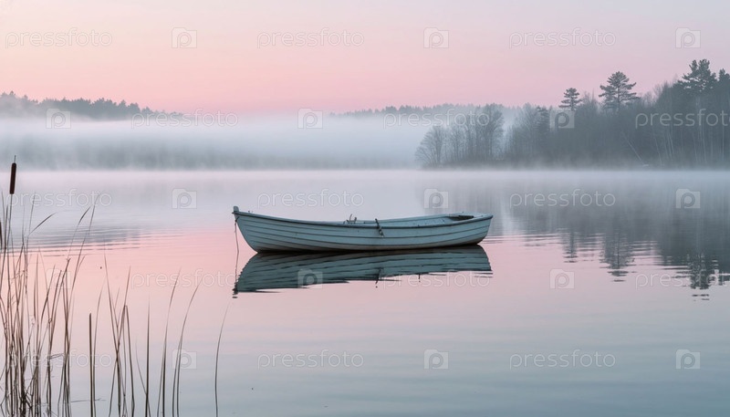 Лодка на озере во время нежного рассвета в тумане