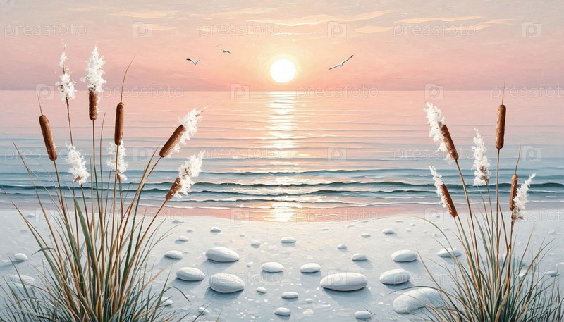 Нежный морской пейзаж на рассвете. Сюрреалистическая картина природы