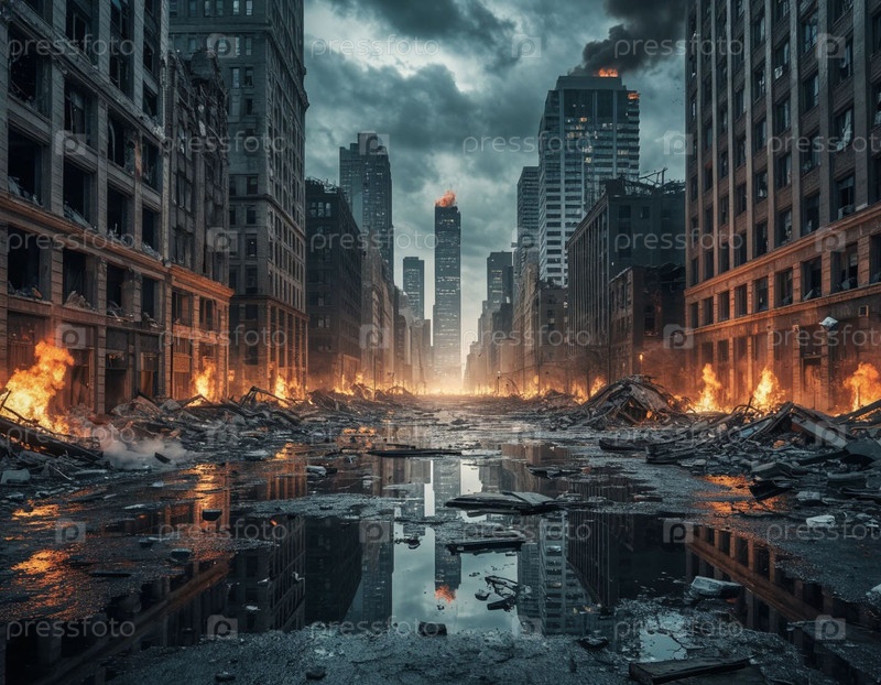 Апокалиптический городской пейзаж, разрушенный город. Сюрреализм