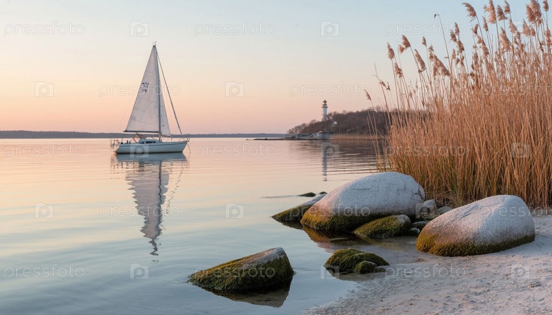 Лодка с парусом на озере во время нежного восхода солнца