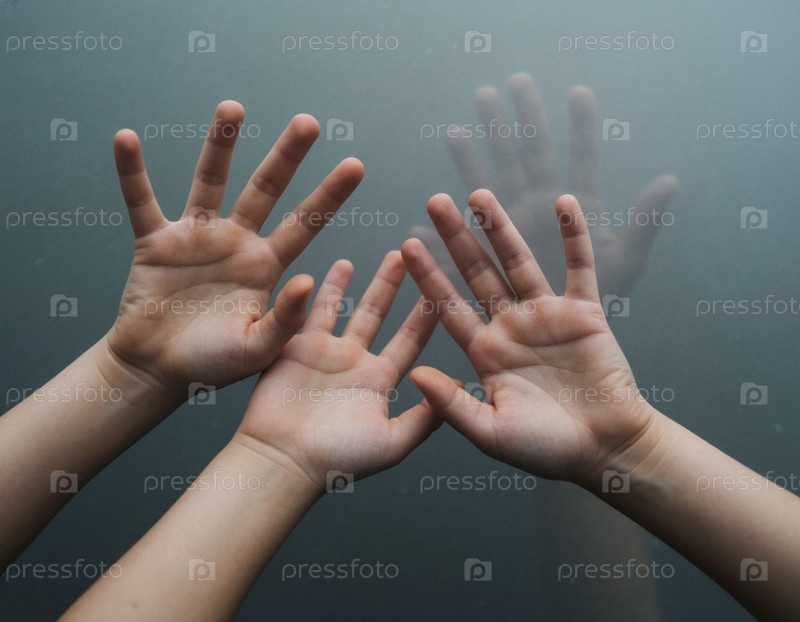 Детские руки протягивают руку помощи от тумана. Сюрреализм
