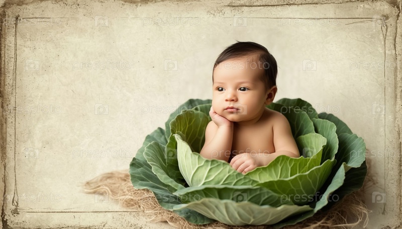Винтажная открытка с новорожденным ребенком в капусте, дизайн объявления о рождении