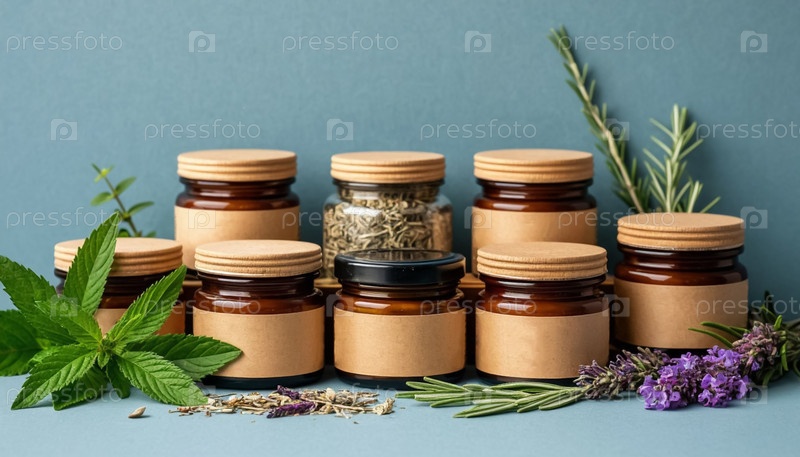 Лекарственные травы в Eco Wooden Джарс на синем фоне, коллекция натурального чая