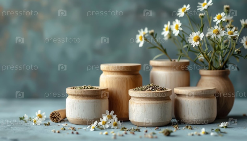 Лекарственные травы и семена в эко-упаковке на пастельном фоне