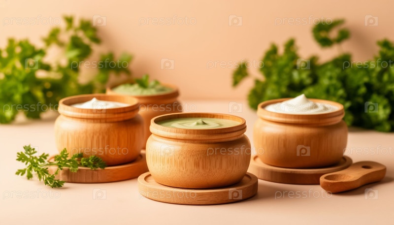 Натуральный крем ручной работы в эко деревянных банках на бежевом пастельном фоне