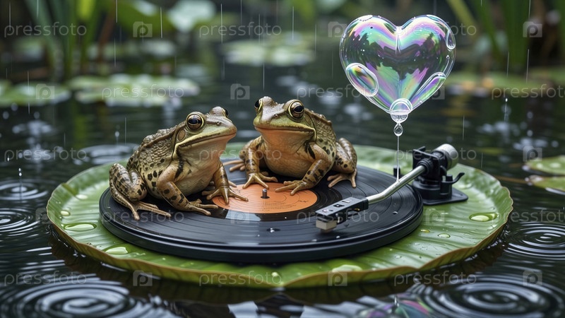 Лягушки на дождливом пруду делятся сладкой мелодией с воздушным шаром