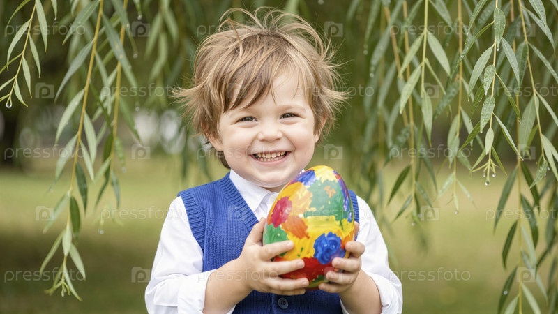 Счастливый ребенок держит красочное пасхальное яйцо с листьями ивы